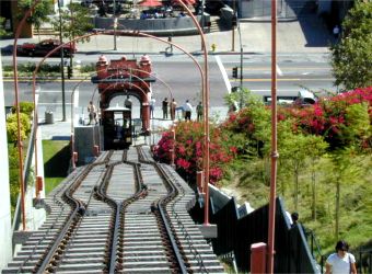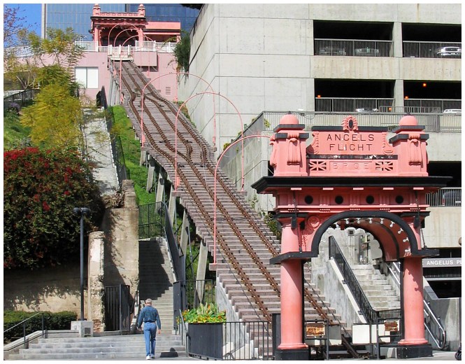 1] El Pueblo Grande by John D. Weaver, printed privately page 73. [2] (Los Angeles, A guide to the City and its Environs; compiled by the Workers and Writers Program of the Works Project Administration in Southern California published 1941 [3] The basic principle of funicular operation is that two cars are attached to each other by a cable, which runs through a pulley at the top of the incline. Counterbalancing of the two cars, with one ascending and one descending the slope — especially when transporting similar loads, such as passengers — minimizes the energy needed to lift the ascending car. [4] http://en.wikipedia.org/wiki/Angels_Flight
